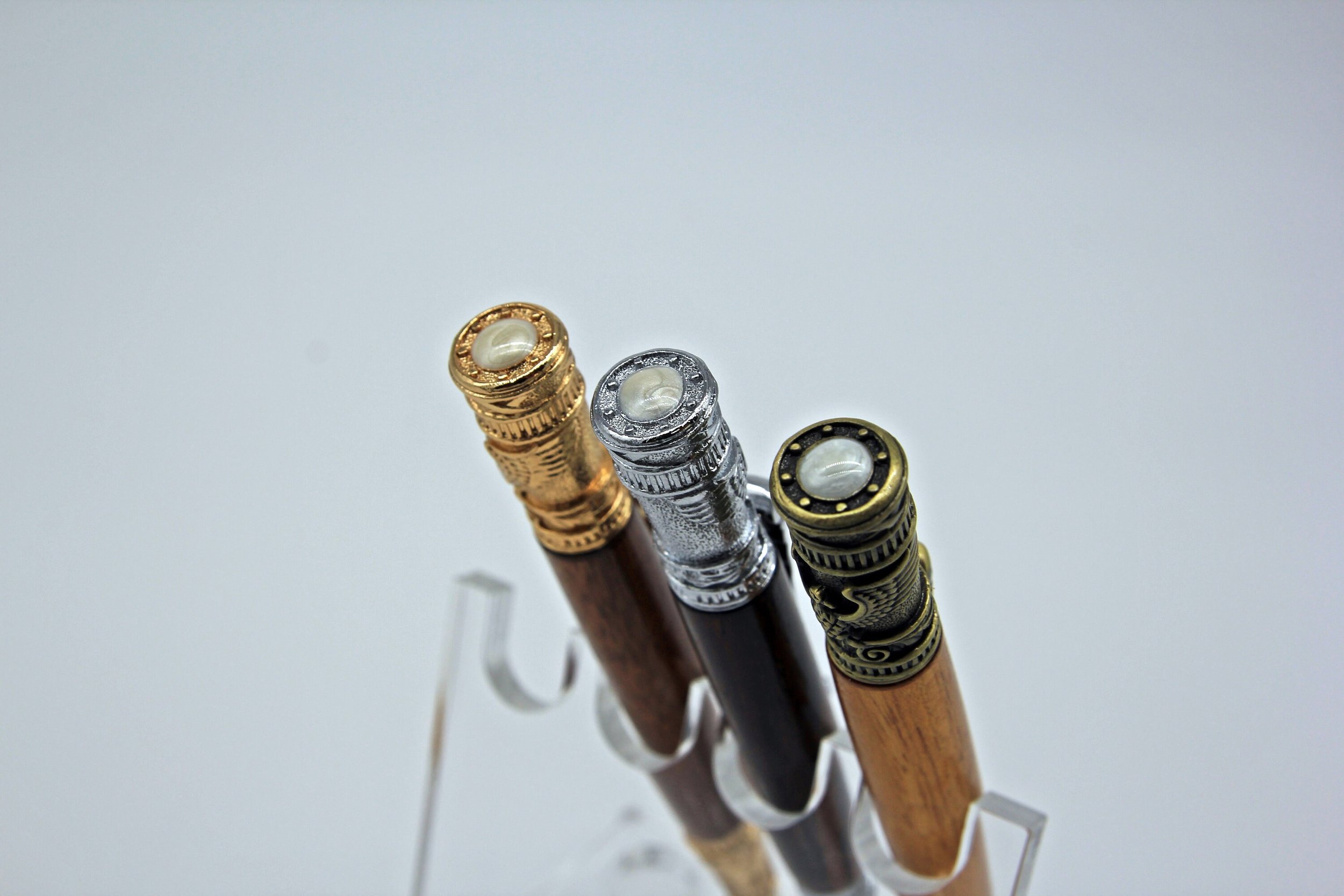 **For pen finish example pictures, please refer to second photo in post, lettering system A-C. Options are: A) Antique Brass, B) Chrome, C) 24 kt Gold.